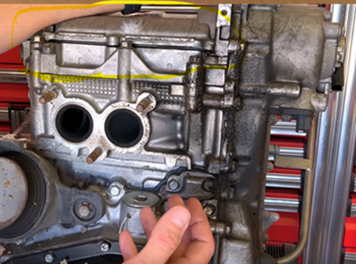 Example of a leaky cam carrier seal: Notice the cam carrier highlighted in yellow and the oil buildup below to the right